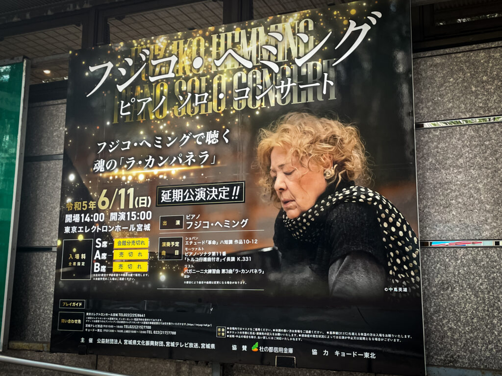 昨年(2022年)3月16日に起きた大地震の影響により公演延期となってしまった、そのおよそ2ヶ月半後の6月5日にここ仙台で開催されるはずだったフジコ・ヘミング ピアノソロコンサート。