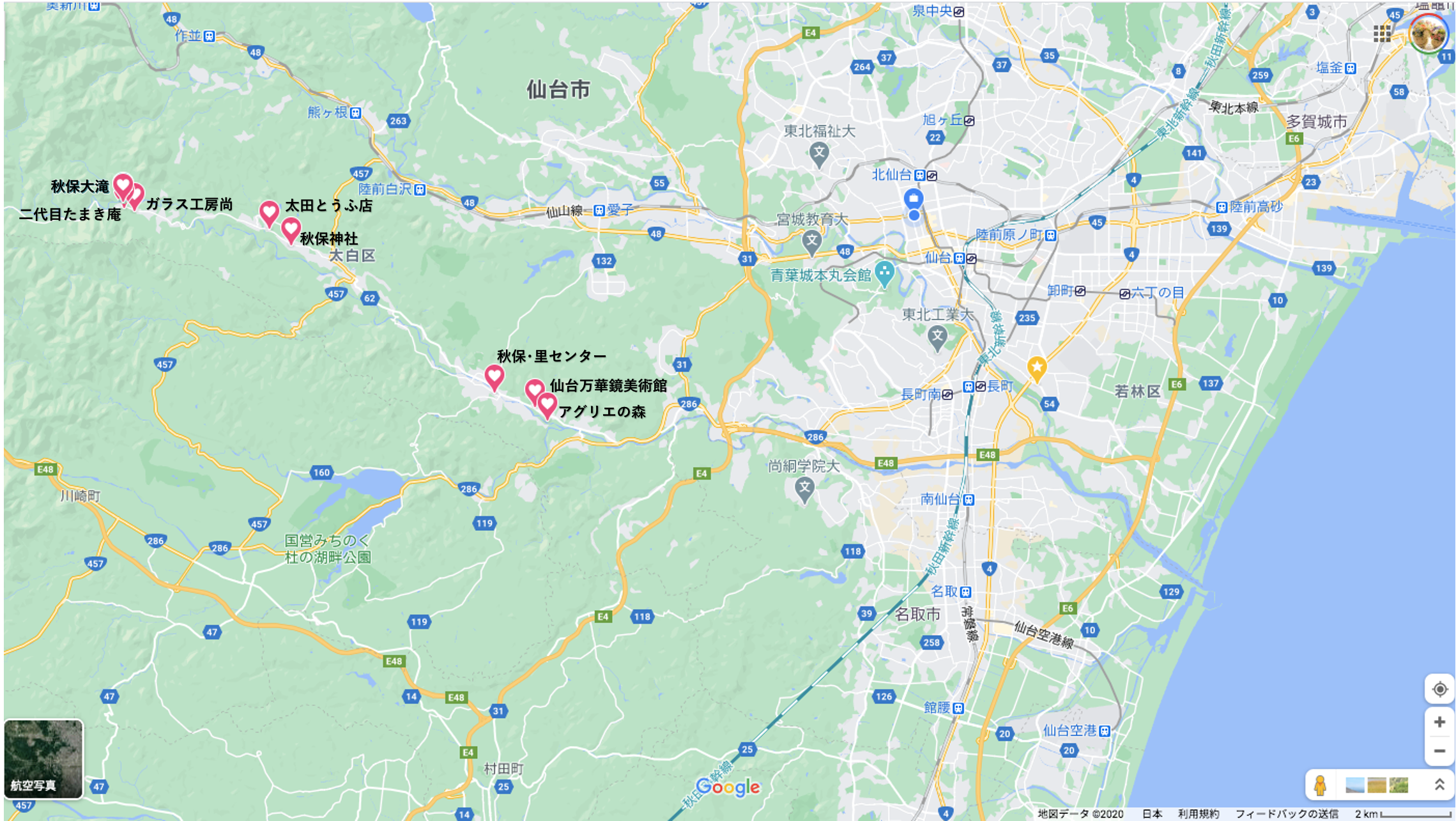 最後にご参考まで、今回の秋保の旅での訪問先の位置関係は下図の通りです。