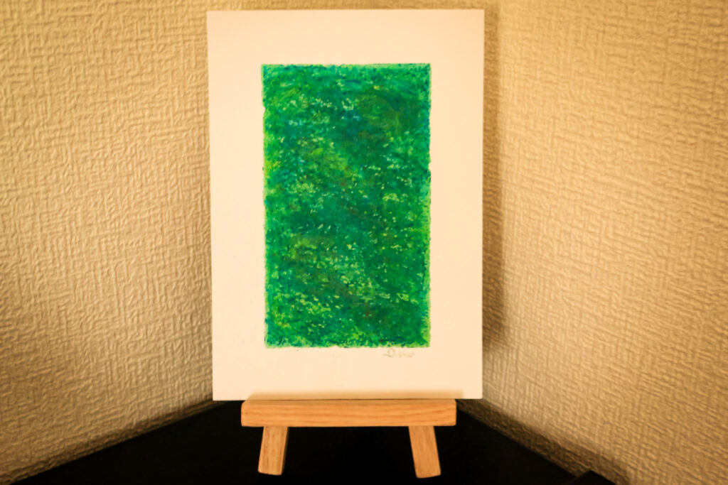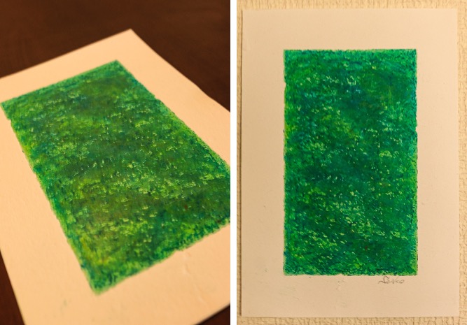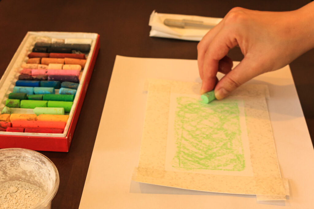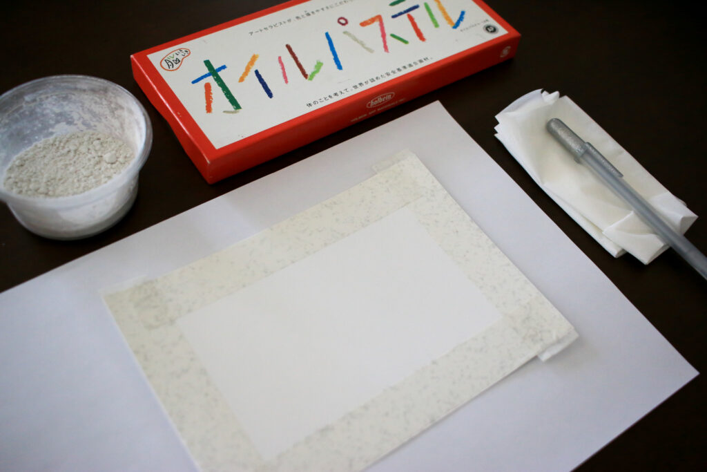 下準備として4辺をマスキングした用紙に、オイルパステルの中から好きな色をまず1色選んで、一面を塗っていきます。