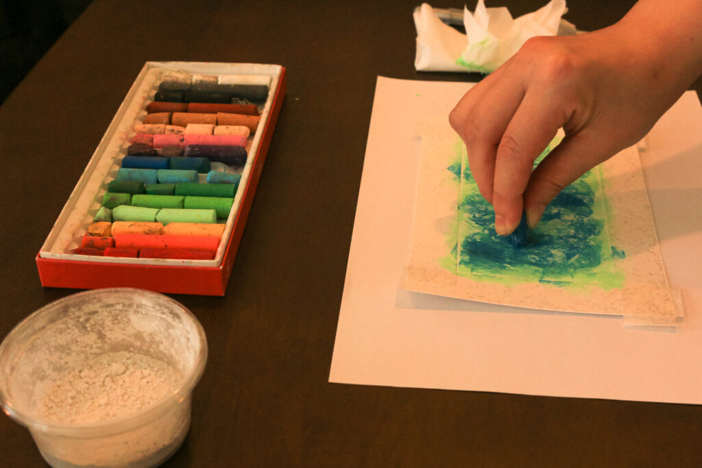 オイルパステルを寝かせて、立てて、塗り込んでいくと、ところどころで感触が違うのがわかります。