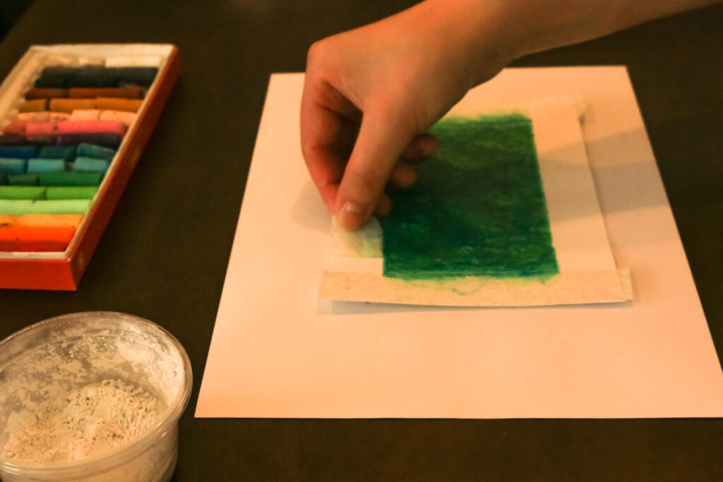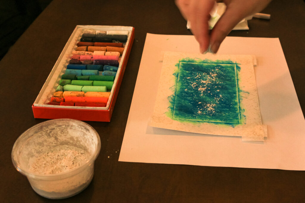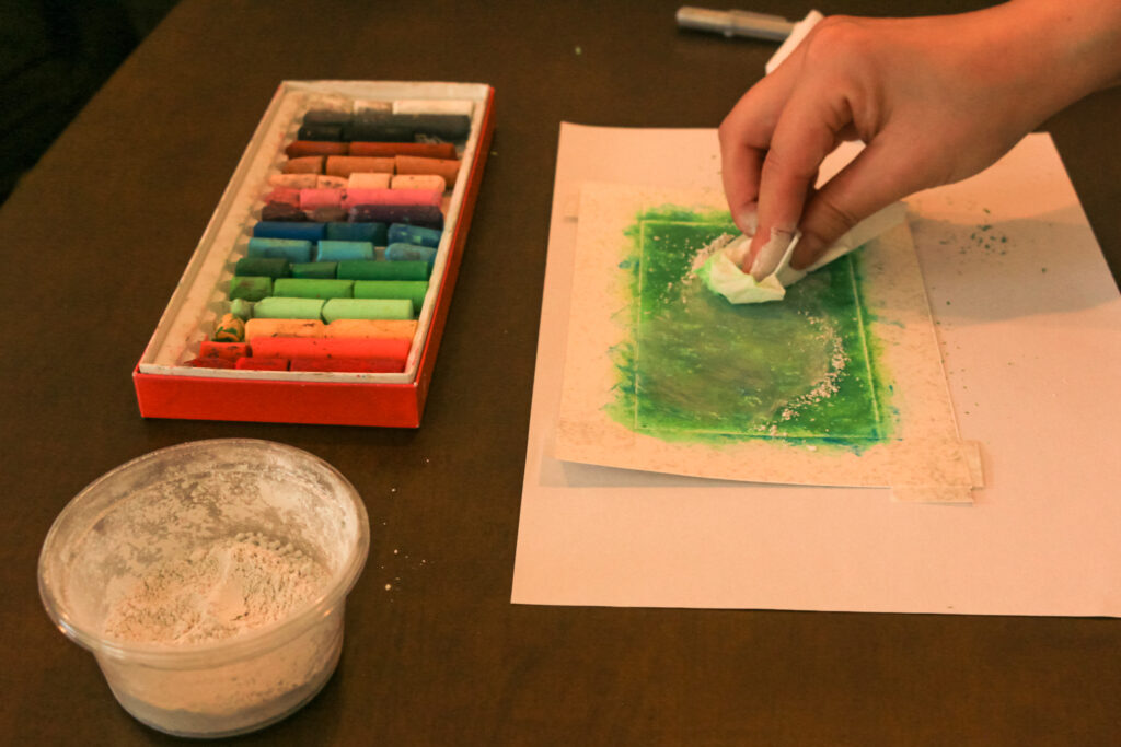 ここにパウダーをかけてなじませて、パステルを全面に定着させます。