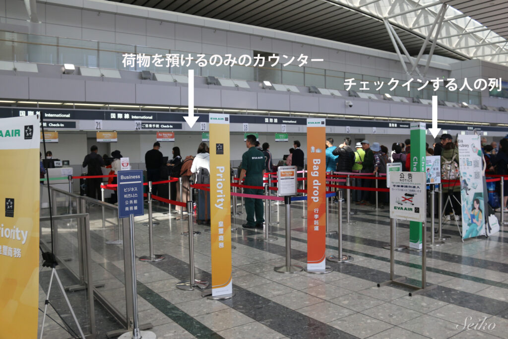 また、どちらの空港も大きいのでカウンターはたくさんあるし、人も多く、チェックイン手続きや荷物を預けるだけでも長い列に並ばなくてはならないし、保安審査にも時間がかかります。