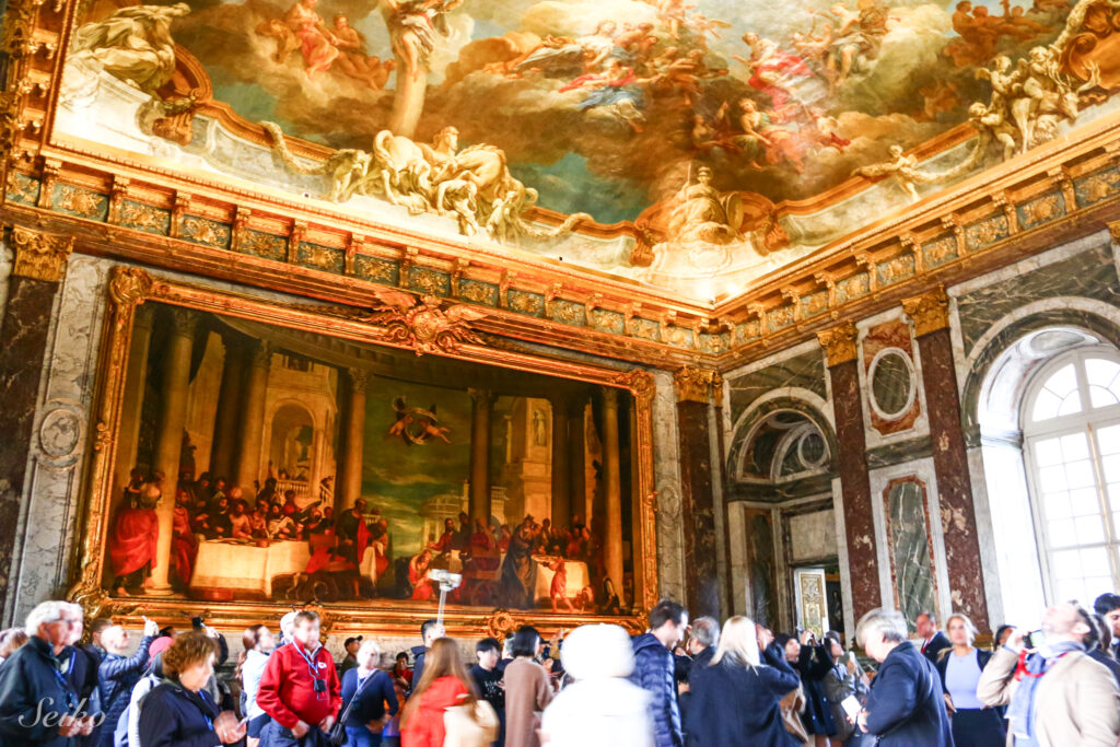 そこはまさに、王の権威と富を象徴する一室。 天井には、フランスの宮廷画家として活躍し、ロココ美術を代表する画家として知られるフランソワ・ルモワーヌ(François Lemoyne、1688-1737)による神話絵画「ヘラクレスの神格化(The Apotheosis of Hercules)」が描かれ、壁には、ティツィアーノやティントレットと並んで、ルネサンス後期のヴェネツィアを代表する画家として評価されるパオロ・ヴェロネーゼ(Paolo Veronese、1528-1588)作の「パリサイ人シモン家の晩餐(The Feast in the House of Simon the Pharisee)」が飾られています。