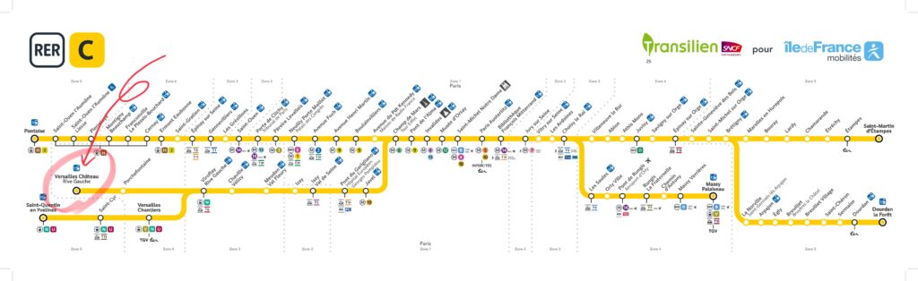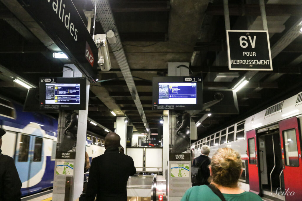 同じくアンヴァリッド(Invalides)駅よりRER(エール・ウー・エール/高速郊外鉄道)のC5線のヴェルサイユ・シャトー・リヴ・ゴーシュ(Versailles Château Rive Gauche)行きに乗り換えて30分強で、ヴェルサイユ宮殿の最寄駅であるヴェルサイユ・シャトー・リヴ・ゴーシュ駅に到着します。