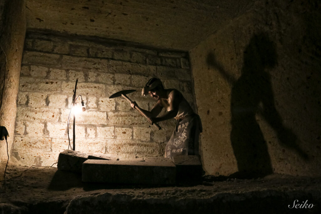 顔も背すじも汗にまみれ、休まず歩く息づかいがあらい。